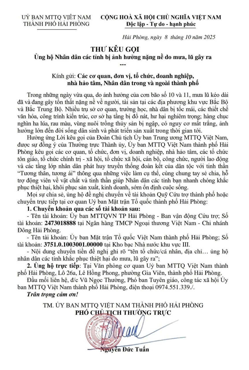THƯ KÊU GỌI ỦNG HỘ NHÂN DÂN CÁC TỈNH BỊ ẢNH HƯỞNG NẶNG NỀ DO MƯA, LŨ GÂY RA CỦA ỦY BAN MẶT TRẬN TỔ QUỐC VIỆT NAM THÀNH PHỐ HẢI PHÒNG