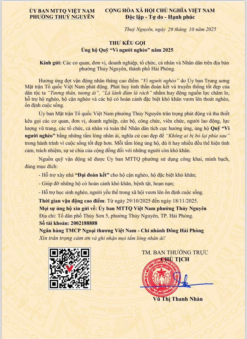 Thư kêu gọi ủng hộ Quỹ “Vì người nghèo năm 2025” của Ủy ban mặt trận tổ quốc Việt Nam phường Thủy Nguyên.